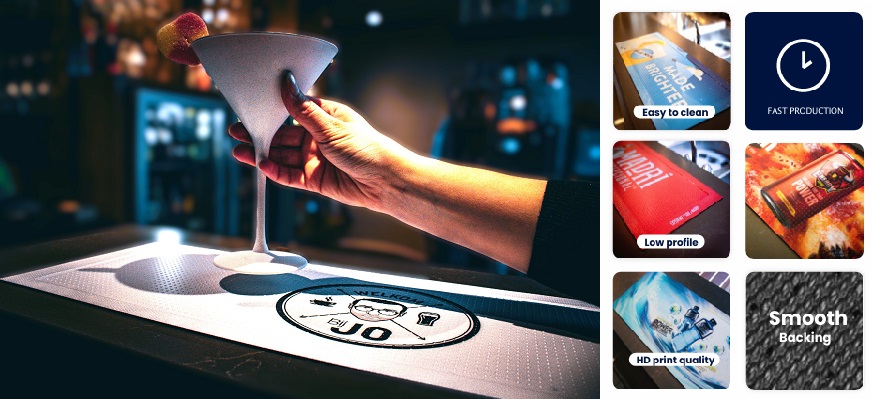 De flex barmat c.q.toonbankmat is mooie innovatie in premium point-of-sale-oplossingen. Het volledig full-colour bedrukbare oppervlak zorgt ervoor dat u uw logo of ontwerp krachtig en briljant overkomt. Dankzij het afwasbare oppervlak is deze eenvoudig schoon te maken, zodat u met minimale inspanning een schone omgeving kunt behouden. deze matten zijn voorzien van rubbere antislip onderlaang. Dikte 1,5 mm. Print bestand uploaden. Wij kunnen tegen een geringe meerprijs u ook helpen bij de opmaak van het printbestand, neemt u hiervoor contact met ons op. Er worden eenmalige instel- en opstartkosten voor het drukken berekend. Aankoop vanaf 20 stuks. Zie voor meer informatie bijgevoegde PDF.Wilt u een prijs aanvragen?